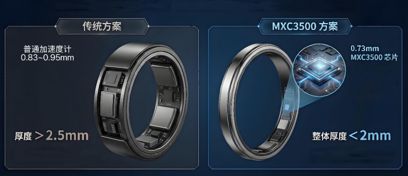 智能戒指市场蓄势待发,凭借“无感佩戴” 的独特优势受到广泛看好。然而相较于常规智能手环,智能戒指空间更局促、电池更小,轻薄与低功耗要求更加严苛,给设计团队带来了前所未有的全新挑战,MXC3500三大硬核优势,在智能戒指赛道全面放大,成为解决行业超小超薄尺寸、超长续航、高精度难题的刚需级传感方案,成为不二之选。