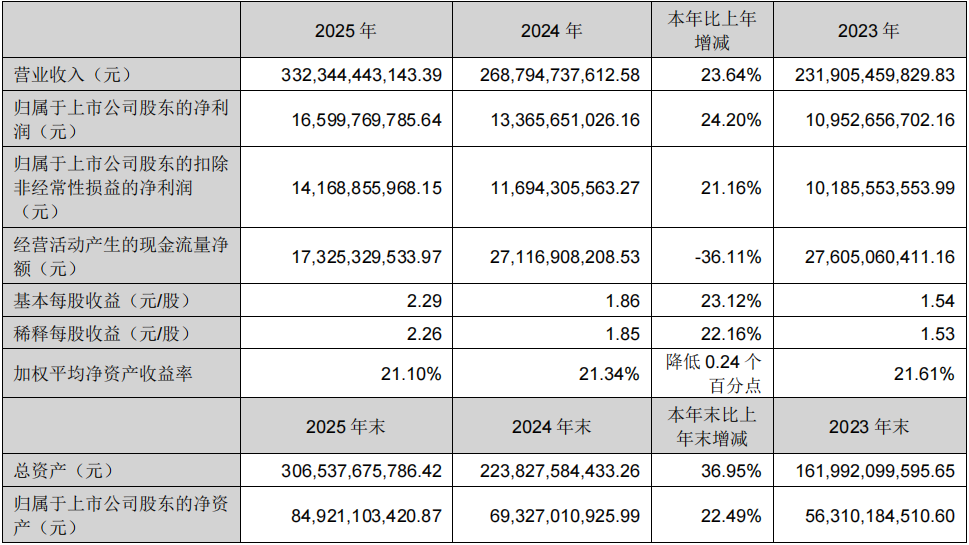 2025年度,公司实现营业收入3323.44亿元,较上年同期增长23.64%;归属于上市公司股东的净利润为165.997亿元,较上年同期增长24.2%;归属于上市公司股东的扣除非经常性损益的净利润为141.69亿元,同比增长21.16%。经营活动产生的现金流量净额为173.25亿元,同比下降36.11%。