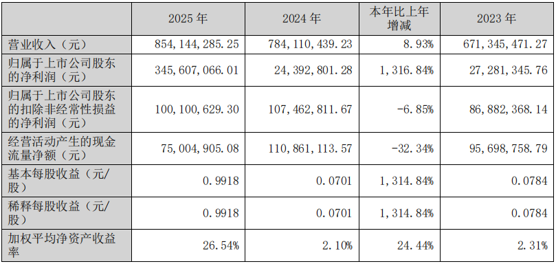 4月14日,江苏南方精工股份有限公司发布2025年年度报告。报告显示,2025年度公司实现营业收入8.54亿元,较上年同期增长8.93%;归属于上市公司股东的净利润为3.46亿元,较上年同期增长1316.84%;归属于上市公司股东的扣除非经常性损益的净利润为1亿元,较上年同期下降6.85%。经营活动产生的现金流量净额为7,500.49万元,同比下降32.34%。