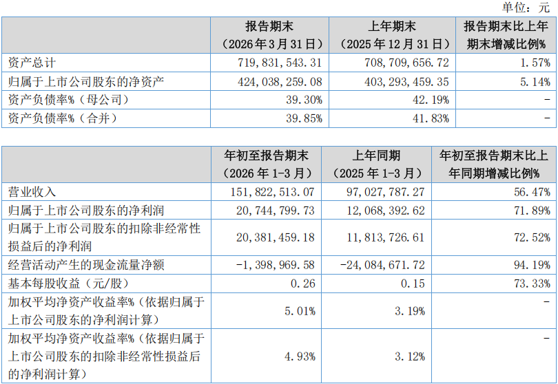 公司表示,2026年第一季度营业收入同比增长56.47%,主要系本期公司销售规模扩大所致;归属于上市公司股东的净利润同比增长71.89%,主要系本期销售规模扩大、盈利能力提升所致。经营活动产生的现金流量净额同比改善94.19%,主要系本期销售商品收到现金流大于购买商品支出现金流所致。