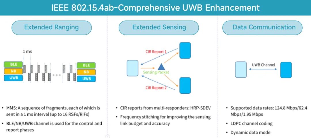 IEEE 802.15.4ab 正是为破解这些痛点而生,它兼容前代 802.15.4z,在 PHY 物理层、MAC 层与测距机制上全面升级,让 UWB 从 “精准定位工具” 进化为 “全场景智能无线底座”。
