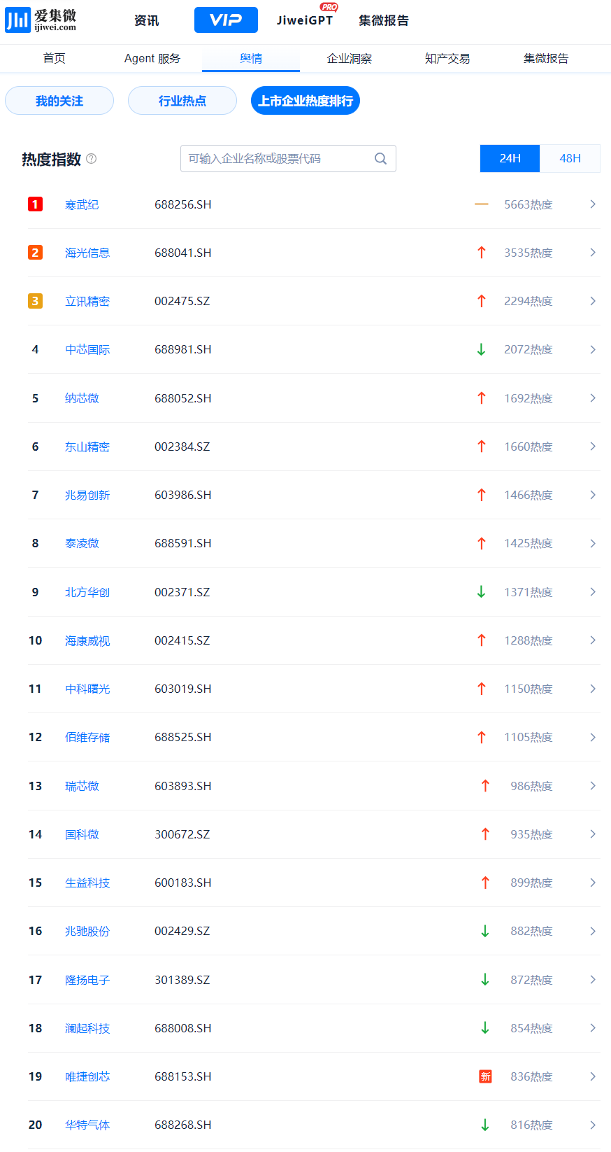 登录爱集微VIP频道,实时查看动态“上市企业热度排行”,穿透洞察每一个波动背后的驱动因素。