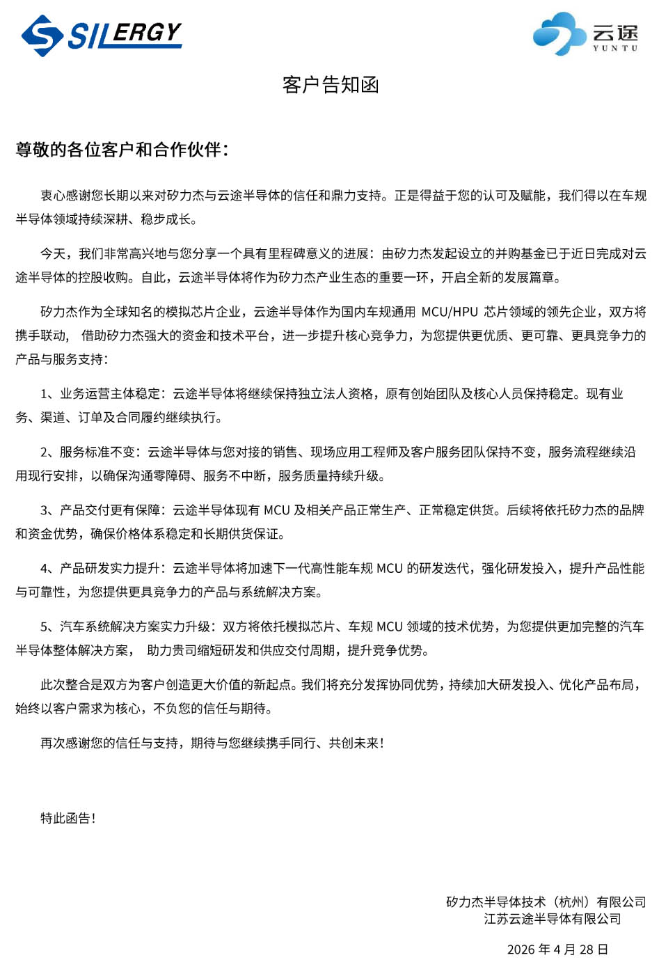 2025年4月28日,矽力杰半导体技术(杭州)有限公司与江苏云途半导体有限公司联合发布《客户告知函》,宣布由矽力杰发起设立的并购基金已于近日完成对云途半导体的控股收购。自此,云途半导体将作为矽力杰产业生态的重要一环,开启全新发展篇章。