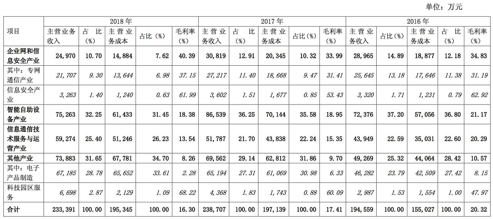 针对公司主营业务的收入、成本、毛利率、净利润等波动,东方通信表示,公司主要业务为企业网和信息安全产业、智能自助设备产业、信息通信技术服务与运营产业以及包括电子产品制造和科技园区服务在内的其他产业。其近三年主营业务分行业的情况如下: