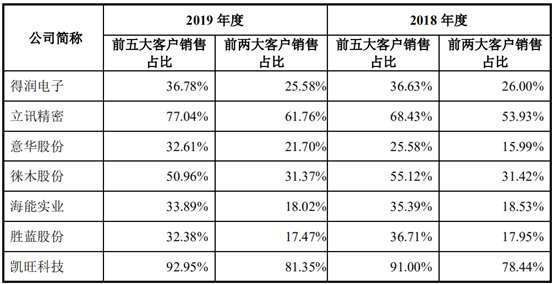 从上述数据来看,凯旺科技第一大客户和第二大客户的销售收入,合计占其营业收入的比例分别为78.44%、81.35%和77.7%,占据其整体营收近八成,这在同行业可比上市公司中,几乎鲜少有之(详见下图)。