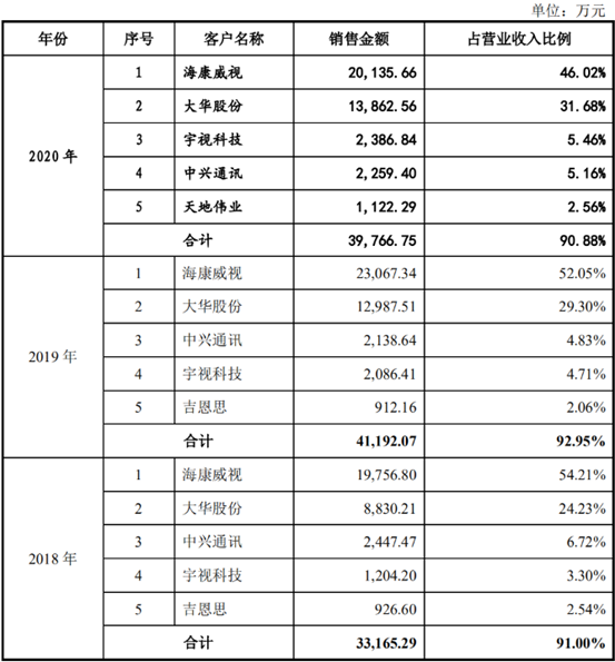 与此同时,其向第一大客户海康威视的销售收入分别为1.98亿元、2.31亿元和2.01亿元,占营业收入比例分别为54.21%、52.05%和46.02%,近三年平均占比超五成;向第二大客户大华股份的销售收入分别为8830.21万元、1.3亿元和1.39亿元,占营业收入的比例分别为24.23%、29.3%和31.68%。