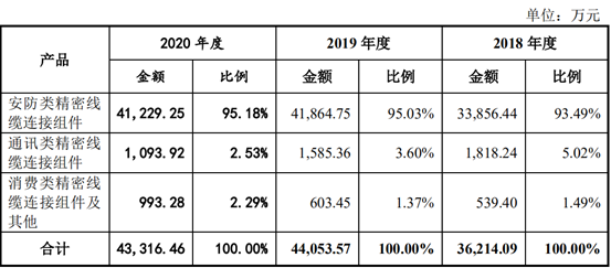 在主营业务中,安防类精密线缆连接组件实现的销售收入分别为3.39亿元、4.19亿元和4.12亿元,占主营业务收入比例分别为93.49%、95.03%和95.18%。