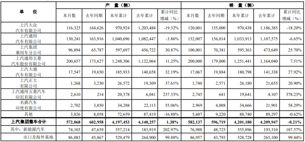 11月4日,上汽集团发布10月份产销快报,该月实现汽车销量为582137辆,低于上年同期的596719辆;今年1-10月份,合计汽车销量为4201180辆,同比下滑0.21%。产量方面,10月生产整车572068辆,低于去年同期的602958辆;今年1-10月合计生产汽车4197453辆,同比增长1.38%。