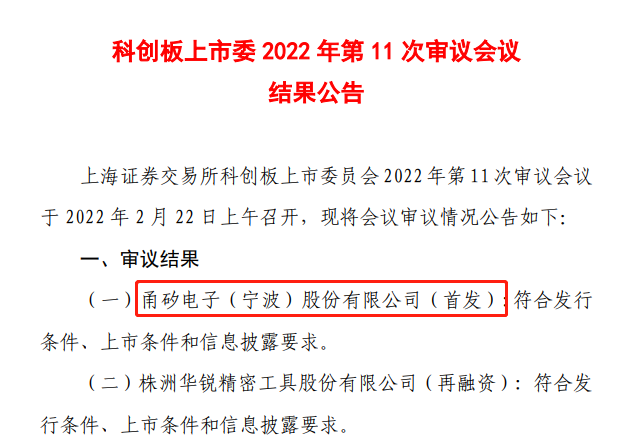 2月22日晚间,科创板上市委2022年第11次审议会议结果公告显示,甬矽电子(宁波)股份有限公司(下称:甬矽电子)已于2月22日科创板首发过会。