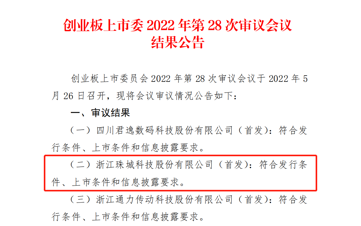 (文/姜翠)5月26日,据创业板上市委2022年第28次审议会议结果公告显示,浙江珠城科技股份有限公司(首发):符合发行条件、上市条件和信息披露要求。