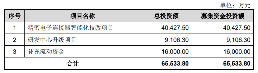 拟募资6.55亿元,用于电子连接器技改等项目