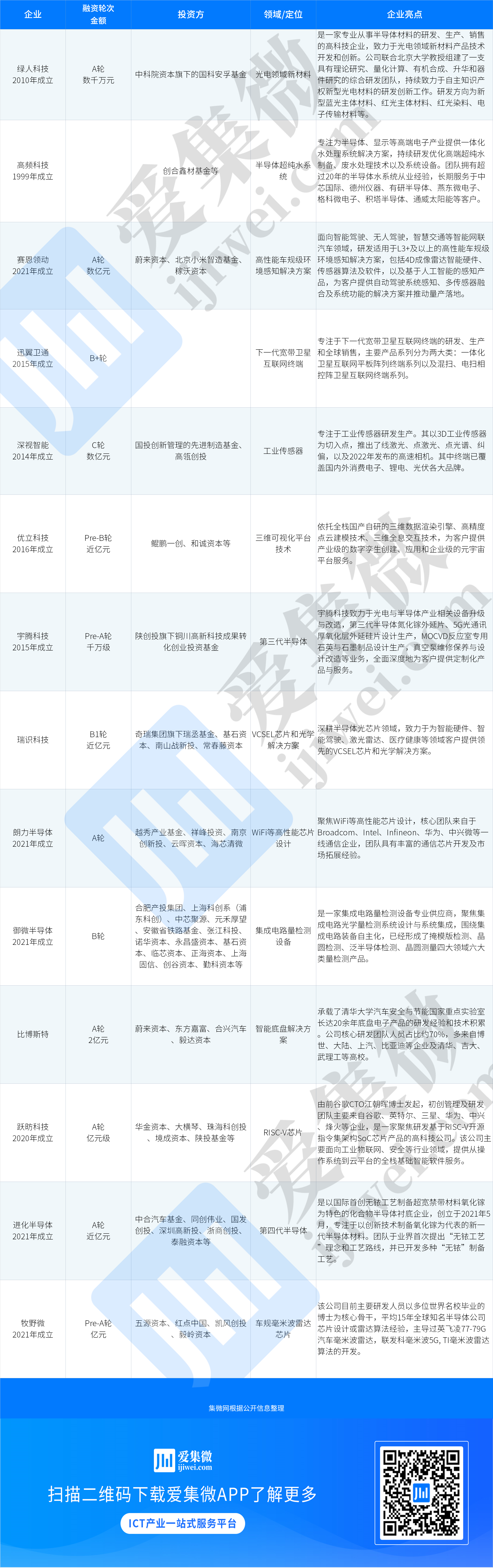 一周融资:跃昉科技、进化半导体、御微半导体等获新一轮融资 作者: 刘沁宇 2023-04-16 相关舆情 AI解读 生成海报 来源:爱集微 #芯融资# 评论 收藏 点赞 2.6w 超14家企业获新一轮融资,融资规模超14亿元。 深视智能、赛恩领动等融资规模较高。 获融资企业来自第三代半导体、RISC-V芯片、第四代半导体等领域。 (校对/吕佳妮) 责编: 赵碧莹 来源:爱集微 #芯融资# 收藏 点赞 分享至: 微信扫一扫分享 THE END *此内容为集微网原创,著作权归集微网所有,爱集微,爱原创 相关推荐 一周融资(11.13-11.17):星纪魅族、奕行智能、晟联科等获新一轮融资 一周融资(11.6-11.12):时创意、玏芯科技、芯感智等获新一轮融资 【芯融资】自动驾驶的“智慧之眼”,激光雷达热度不减 一周融资(10.30-11.3):云途半导体、世瞳微电子、芯钛科技等获新一轮融资 一周融资(10.23-10.27):芯德半导体、成川科技、华清电子等获新一轮融资 一周融资(10.16-10.20):星微科技、芯聚威、欧冶半导体等获新一轮融资 +关注 刘沁宇 微信:18861004828 邮箱:liuqy@ijiwei.com 3073文章总数 221.4w总浏览量 最近发布 砺芯半导体:一站式芯片设计服务专家,解决芯片设计最后一公里难题 2023-12-06 集微咨询发布《自动驾驶的“最后一公里”:从学术角度分析自动泊车技术》报告 2023-11-30 东方晶源:持续加强知识产权体系建设,积极践行集成电路制造良率管理技术新路线 2023-11-30 北京中电科:100%自主研发,WG-1261全自动减薄机已进入量产阶段 2023-11-27 爱芯元智:M76H驰骋智驾赛道,让AI应用不再遥不可及 2023-11-27 获取更多内容 最新资讯 【科学自立自强】西安交大张明明教授团队在单原子调控精准光催化领域取得新进展 35分钟前 中国科大高频集成电压调节器芯片与高性能环形行波振荡器芯片亮相A-SSCC 2025 36分钟前 上海交大集成电路学院4篇研究论文入选IEDM 2025大会 36分钟前 中国科学院半导体所在高精度光计算领域取得新进展 39分钟前 上海交大计算机学院并行与分布式系统研究所学生获2025 AMD推理优化全球挑战赛唯一特等奖 41分钟前 【科技自立自强】西安交大徐友龙教授团队在固态钠金属电池研究领域取得进展 44分钟前