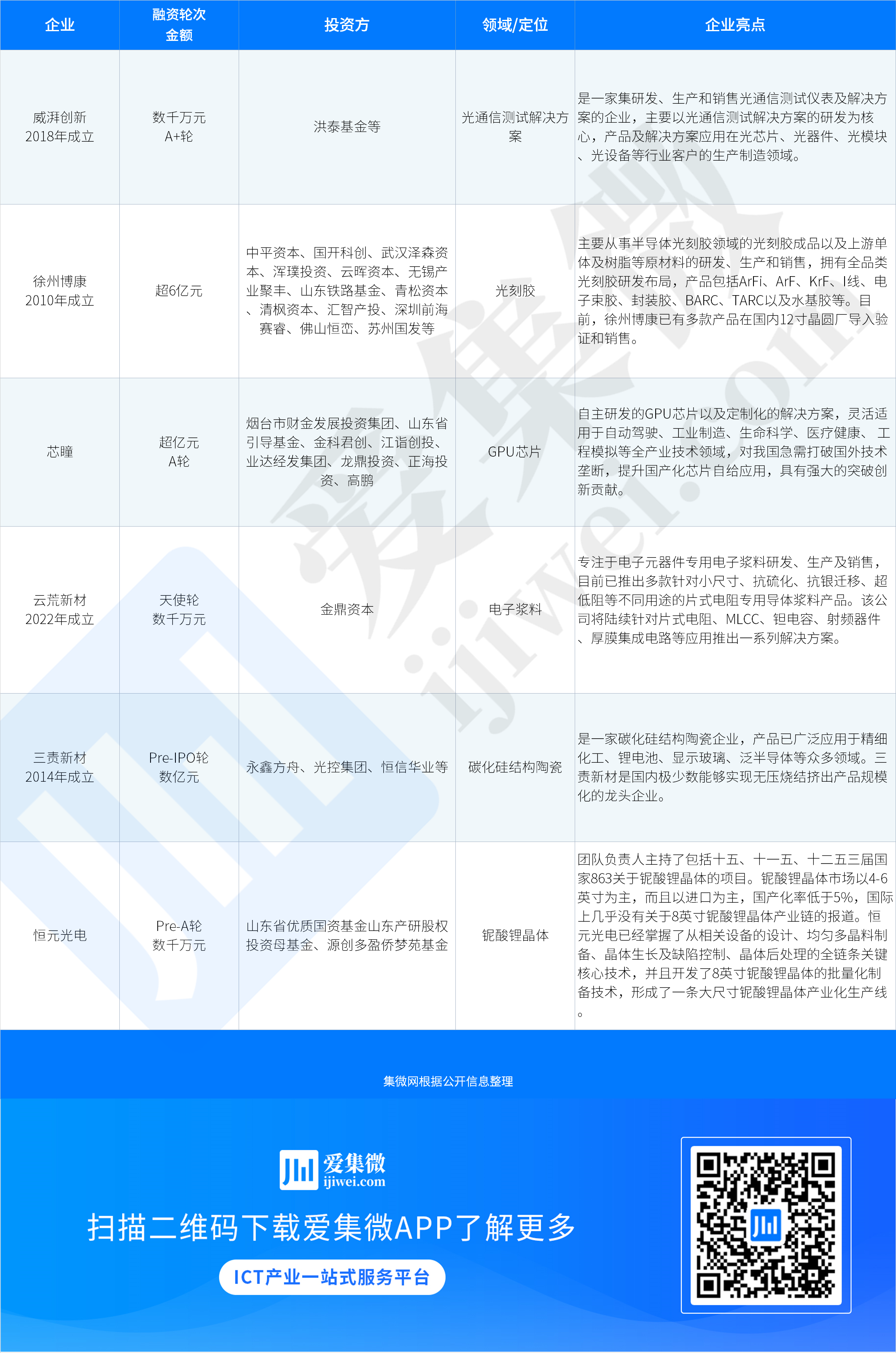 一周融资:徐州博康、恒元光电、威湃创新等获新一轮融资 作者: 刘沁宇 2023-04-23 相关舆情 AI解读 生成海报 来源:爱集微 #芯融资# 评论 收藏 点赞 2.3w 超6家企业获新一轮融资,融资规模超11亿元。 徐州博康、三责新材等融资规模较高。 获融资企业来自光刻胶、GPU芯片、碳化硅等领域。 (校对/吕佳妮) 责编: 韩秀荣 来源:爱集微 #芯融资# 收藏 点赞 分享至: 微信扫一扫分享 THE END *此内容为集微网原创,著作权归集微网所有,爱集微,爱原创 相关推荐 一周融资(11.13-11.17):星纪魅族、奕行智能、晟联科等获新一轮融资 一周融资(11.6-11.12):时创意、玏芯科技、芯感智等获新一轮融资 【芯融资】自动驾驶的“智慧之眼”,激光雷达热度不减 一周融资(10.30-11.3):云途半导体、世瞳微电子、芯钛科技等获新一轮融资 一周融资(10.23-10.27):芯德半导体、成川科技、华清电子等获新一轮融资 一周融资(10.16-10.20):星微科技、芯聚威、欧冶半导体等获新一轮融资 +关注 刘沁宇 微信:18861004828 邮箱:liuqy@ijiwei.com 3073文章总数 221.4w总浏览量 最近发布 砺芯半导体:一站式芯片设计服务专家,解决芯片设计最后一公里难题 2023-12-06 集微咨询发布《自动驾驶的“最后一公里”:从学术角度分析自动泊车技术》报告 2023-11-30 东方晶源:持续加强知识产权体系建设,积极践行集成电路制造良率管理技术新路线 2023-11-30 北京中电科:100%自主研发,WG-1261全自动减薄机已进入量产阶段 2023-11-27 爱芯元智:M76H驰骋智驾赛道,让AI应用不再遥不可及 2023-11-27 获取更多内容 最新资讯 打破“卡脖子”困局 国产半导体材料企业同创普润启动IPO辅导 7小时前 德同兴电子启动北交所上市辅导 7小时前 【IPO一线】三地一芯启动上市辅导 专注存储主控芯片领域十余载 7小时前 宏明电子创业板IPO获深交所审核通过 8小时前 国芯科技三度增资龙擎视芯 卡位“AI+商业航天”新赛道 8小时前 【一周芯热点】长江存储起诉美国国防部、商务部;商务部:推动安世荷兰尽快派员来华 11小时前