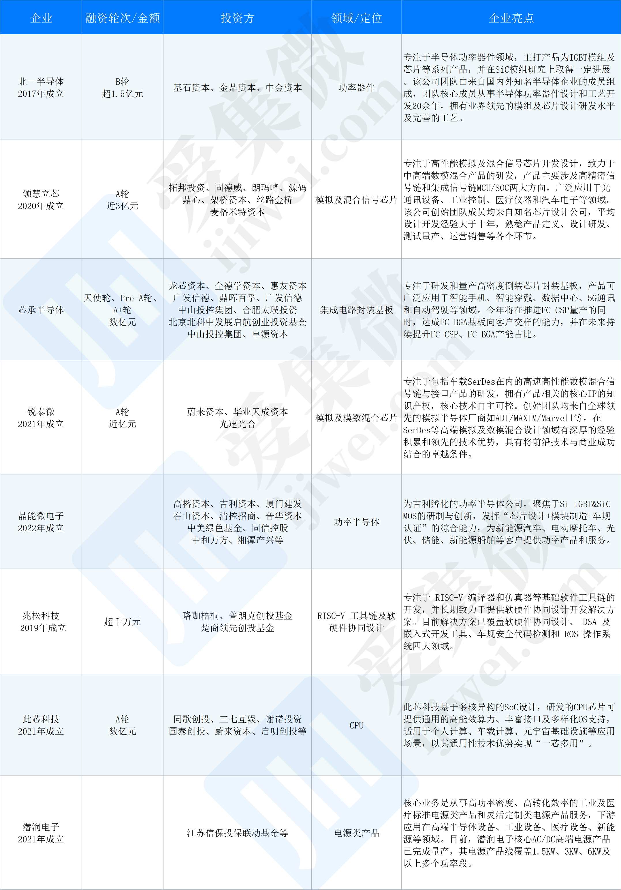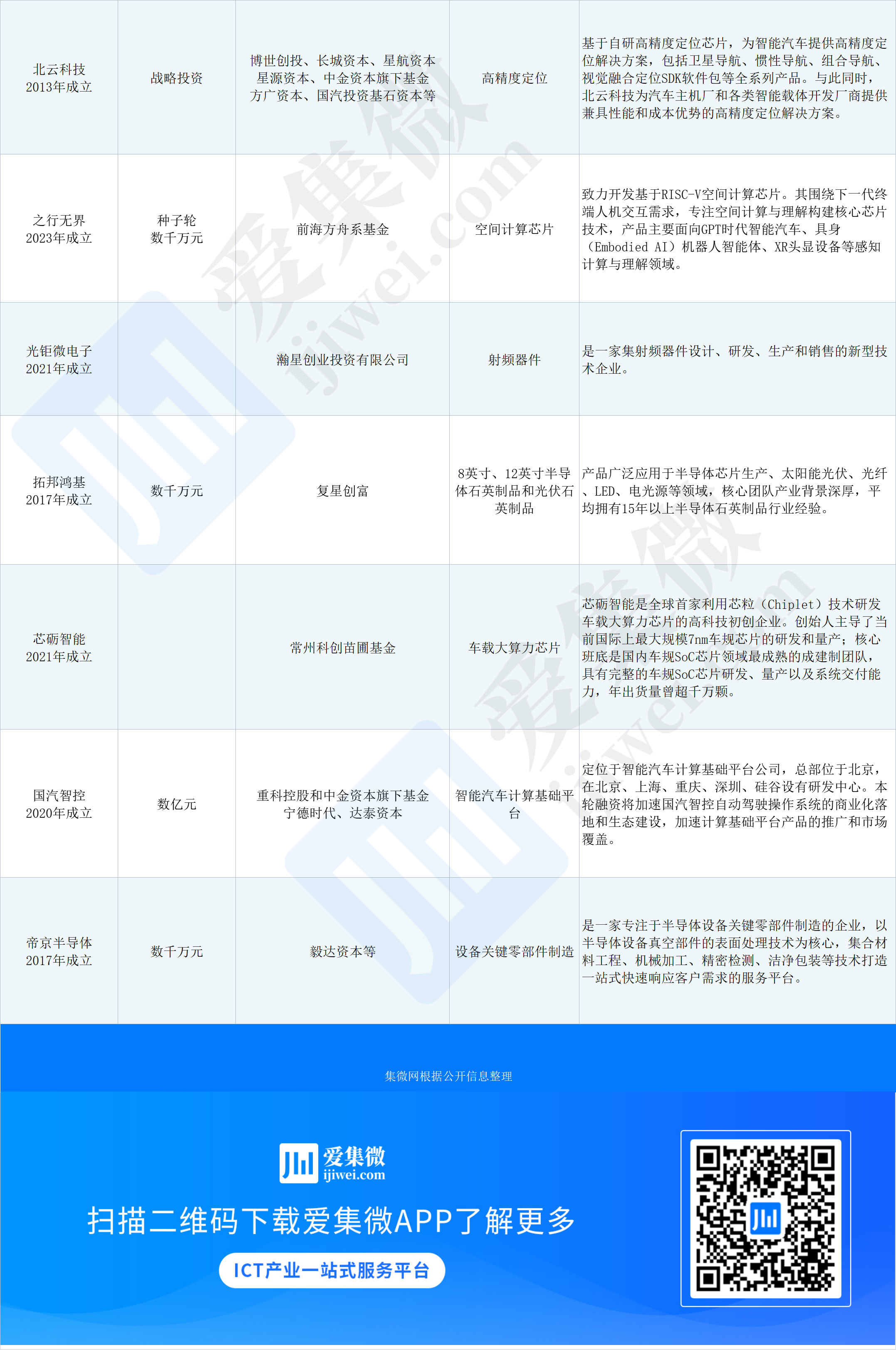 一周融资(6.19-6.25):北一半导体、领慧立芯、芯承等获新一轮融资 作者: 刘沁宇 2023-06-25 相关舆情 AI解读 生成海报 来源:爱集微 #芯融资# 评论 收藏 点赞 2.4w 超15家企业获新一轮融资,融资规模超17亿元。北一半导体、领慧立芯、芯承半导体等融资规模较高。获融资企业来自功率半导体、射频器件、空间计算芯片等领域。(校对/姜羽桐) 责编: 赵碧莹 来源:爱集微 #芯融资# 收藏 点赞 分享至: 微信扫一扫分享 THE END *此内容为集微网原创,著作权归集微网所有,爱集微,爱原创 相关推荐 一周融资(11.13-11.17):星纪魅族、奕行智能、晟联科等获新一轮融资 一周融资(11.6-11.12):时创意、玏芯科技、芯感智等获新一轮融资 【芯融资】自动驾驶的“智慧之眼”,激光雷达热度不减 一周融资(10.30-11.3):云途半导体、世瞳微电子、芯钛科技等获新一轮融资 一周融资(10.23-10.27):芯德半导体、成川科技、华清电子等获新一轮融资 一周融资(10.16-10.20):星微科技、芯聚威、欧冶半导体等获新一轮融资 +关注 刘沁宇 微信:18861004828 邮箱:liuqy@ijiwei.com 3073文章总数 221.4w总浏览量 最近发布 砺芯半导体:一站式芯片设计服务专家,解决芯片设计最后一公里难题 2023-12-06 集微咨询发布《自动驾驶的“最后一公里”:从学术角度分析自动泊车技术》报告 2023-11-30 东方晶源:持续加强知识产权体系建设,积极践行集成电路制造良率管理技术新路线 2023-11-30 北京中电科:100%自主研发,WG-1261全自动减薄机已进入量产阶段 2023-11-27 爱芯元智:M76H驰骋智驾赛道,让AI应用不再遥不可及 2023-11-27 获取更多内容 最新资讯 中科飞测2025年营收大增48.75% 成功实现扭亏为盈 4分钟前 福光股份2025年归母净利润增长33.77% 战略投入加大导致扣非净利润下滑 8分钟前 艾为电子2025年归母净利润大增24.2% 毛利率提升至35%以上 12分钟前 云从科技2025年营收增长25.86% 亏损大幅收窄 17分钟前 天通瑞宏亮相IMFW 2026:学术界和产业界的碰撞 18分钟前 德邦科技2025年营收增长32.61% 先进封装材料国产替代驶入快车道 23分钟前