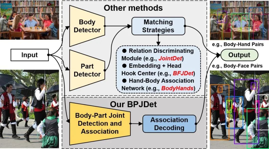 近年来,深度学习助力下的计算机视觉发展突飞猛进,尤其是目标检测领域,各类先进方法表现突出。关于人体及各种身体部位(如面部、手部和头部)的检测也是如此,精准的人体和其部位检测可以用于人群计数和行人流量监控,也可以服务于各种下游任务,如人脸识别、人体姿态估计、行人重识别或人与物体交互检测等。然而,大多数现有的人体或任何身体部位的人体相关检测方法都是孤立的,这使得后期将这些身体部位与归属人体相匹配的过程变得复杂且容易出错。