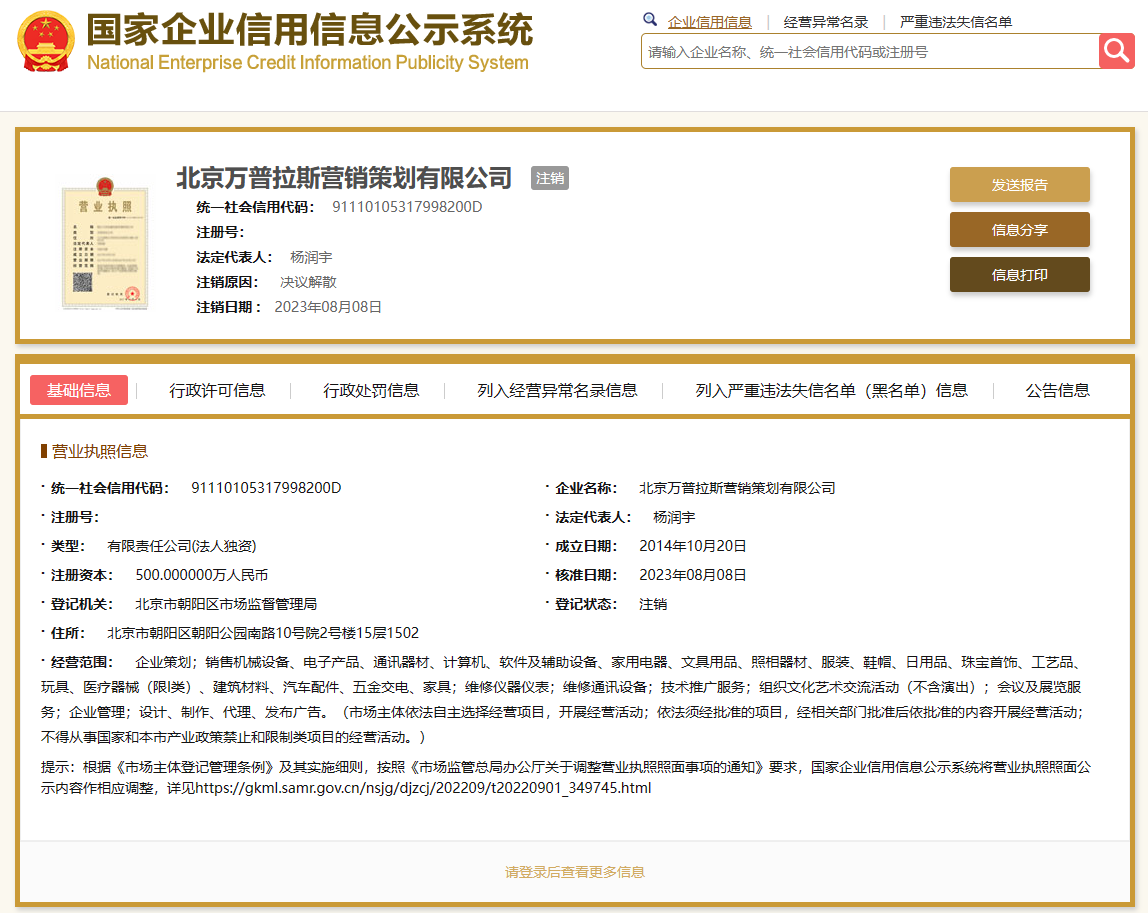 据国家企业信用信息公示系统网站显示,8月8日,北京万普拉斯营销策划有限公司(简称:北京万普拉斯)经营状态由存续变更为注销,注销原因为决议解散。