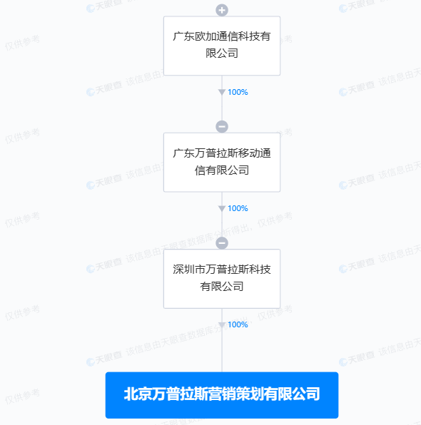 从股权结构来看,天眼查显示,一加手机子公司深圳市万普拉斯科技有限公司持有北京万普拉斯100%股权。