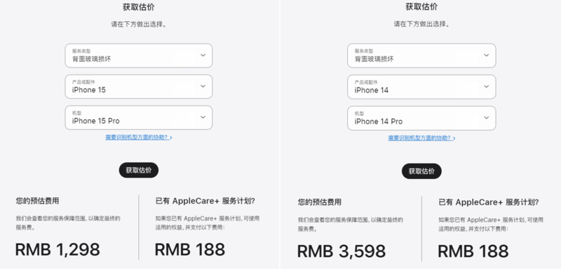 从苹果官网的维修价格可见,苹果iPhone 15 Pro的背板玻璃维修价格为1298元,较前代iPhone 14 Pro的3598元下降幅度高达约64%。