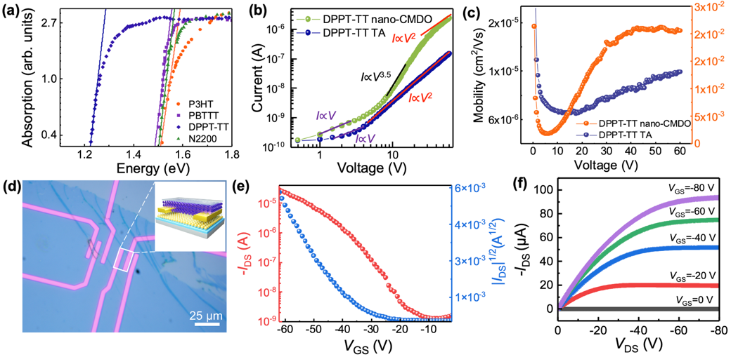 在此基础上,研究团队研究了nano-CMDO制备的共轭聚合物单晶薄膜的电学特性(图3)。光热偏转光谱结果表明,所有共轭聚合物单晶薄膜的Urbach能量均为当前文献报道的最低值,其中N2200单晶薄膜的Urbach能量低至25meV;此外,共轭聚合物单晶薄膜SCLC器件表现出接近理想状态的电荷输运行为;通过优化有机半导体薄膜场效应晶体管制备工艺,DPPT-TT单晶薄膜的晶体管迁移率达到15.5cm2V-1s-1,为其在高性能有机电子器件方面的应用奠定了坚实基础。