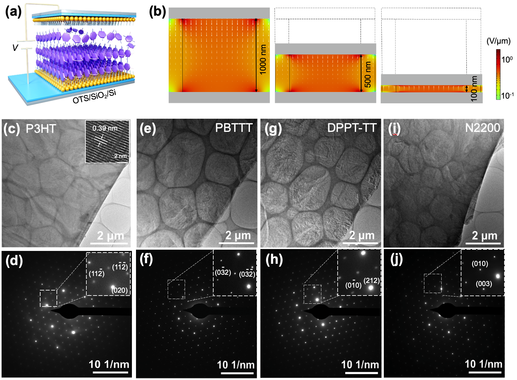 研究团队通过合成高密度十八烷基三氯硅烷(OTS)单分子自组装层修饰基底,利用OTS与共轭聚合物烷基侧链的相互作用,实现基底诱导的共轭聚合物分子链空间垂直取向排列,进而结合电场极化诱导取向,制备一系列不同结构的高质量共轭聚合物单晶薄膜(图2),并深入解析其生长机制,实验证明了nano-CMDO方法具有优异的普适性和鲁棒性。