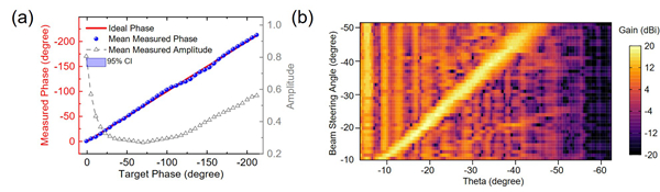 图2. (a)芯片的相位调制精度测量结果,(b)远场方向图