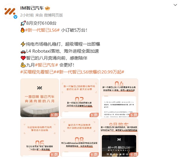 9月1日,智己汽车发文称,8月交付汽车6108台,新一代智己LS6小订破5万台,今日正式开启试驾。