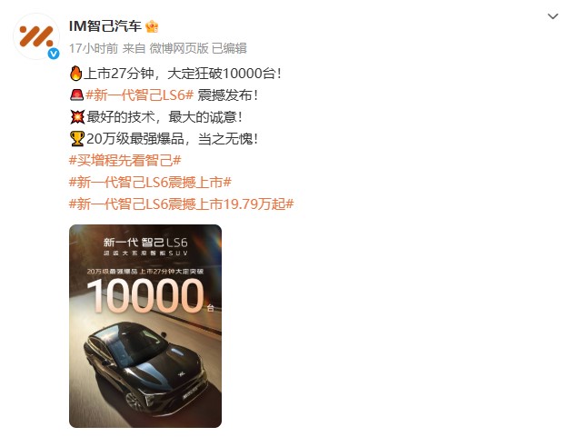 9月11日,智己汽车发文称,新一代智己LS6上市27分钟,大定突破10000台。