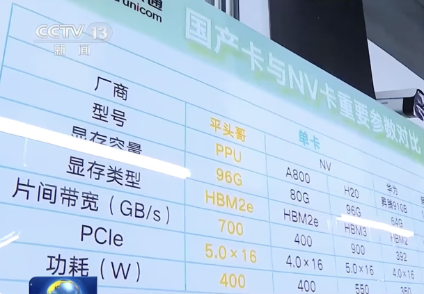 此外,央视还给出了阿里平头哥PPU、英伟达A800、英伟达H20、华为昇腾910B、壁仞104P的算力卡重要参数对比表格。其中,平头哥PPU采用HBM2e显存,显存容量多达96GB,片间带宽为700GB/s,功耗为400W,多项配置规格超过A800、接近H20。