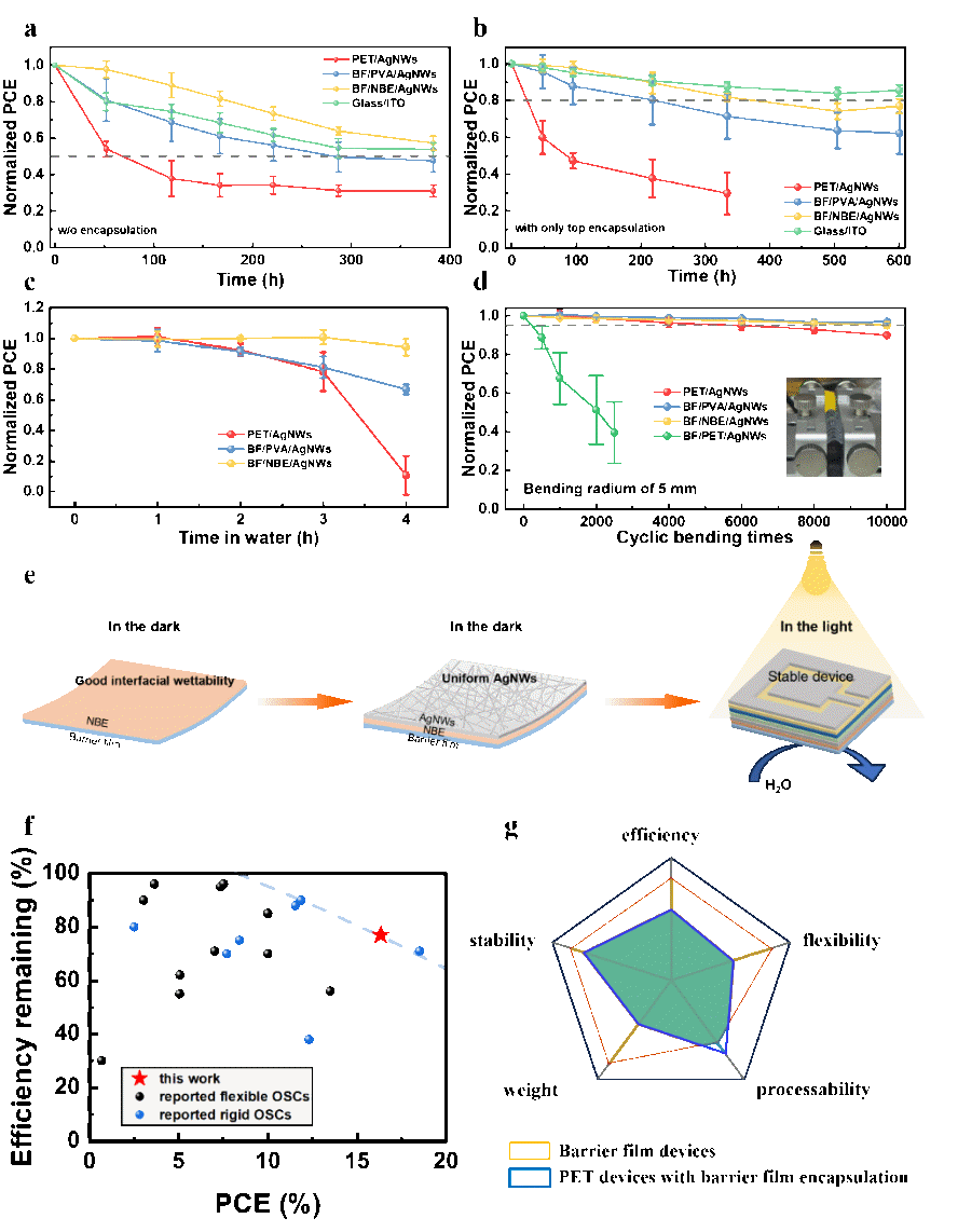 最后,在NBE修饰的阻隔膜上原位制备PM6:L8-BO二元体系和PM6:BTP-BP-4Cl:PC61BM三元体系的FOSCs器件,器件效率分别达到15.28%和16.33%。同时BF/NBE/AgNWs器件在空气中放置600h后仍保留近80%的初始效率,在水中浸泡4h后仍保留平均高达94%的初始效率,且在弯折10000次后仍有95%的初始效率。这说明了亲疏水NBE修饰策略可获得兼具高效率与高稳定性的柔性有机太阳能电池,为解决柔性有机太阳能电池稳定性难题提供了新思路。