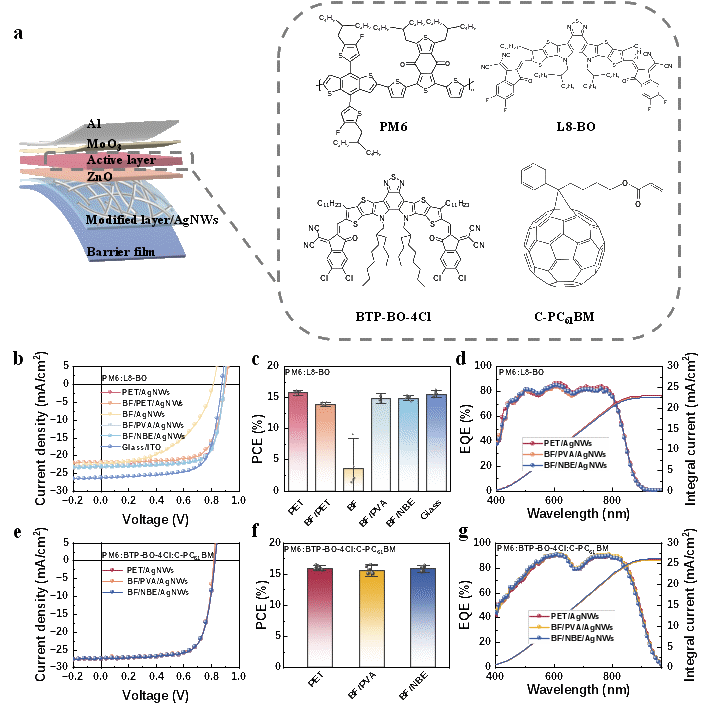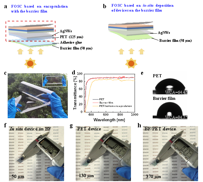 柔性有机太阳能电池(FOSCs)因其高效率、轻柔、可卷对卷印刷等特性,在光伏建筑一体化、可穿戴电子和便携式能源等领域具有巨大的应用潜能。柔性透明导电电极是影响器件效率与稳定性的关键,常规柔性衬底的水氧渗透导致器件性能衰减,严重制约其应用进程,而传统的外层封装结构往往牺牲器件的光学与力学性能,同时会增加器件整体的重量。