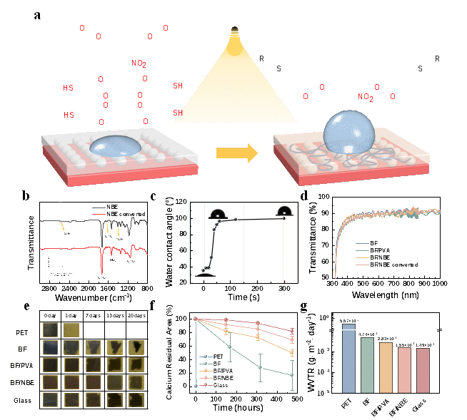 该工作通过钙膜法对不同修饰基材的水蒸气透过率(WVTR)进行对比测试。通过引入亲水材料聚乙烯醇(PVA)作为参照,系统性地探究了可亲疏水转换材料与亲水材料的修饰性能差异。结果可以看到经过NBE修饰后的阻隔膜WVTR能够接近玻璃材料,有着较高的阻隔性能。