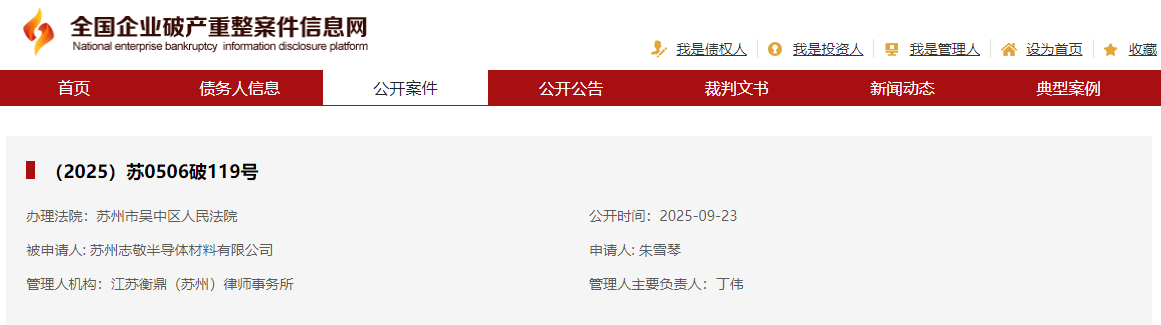 据全国企业破产重整案件信息网信息显示,苏州志敬半导体材料有限公司破产清算。