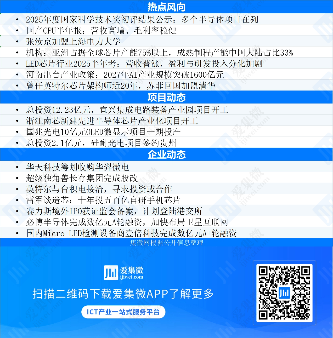 本周消息,张汝京加盟上海电力大学;国产算力芯片迎高光时刻;国产CPU半年报出炉:营收高增、毛利率稳健;曾任英特尔芯片架构师近20年,苏菲回国加盟清华;总投资12.23亿元,宜兴集成电路装备产业园项目开工;雷军谈造芯;华天科技筹划收购华羿微电;同时,透过财报看产业,国产 CPU 产业的发展正在驶上快车道,国产算力芯片迎高光时刻。