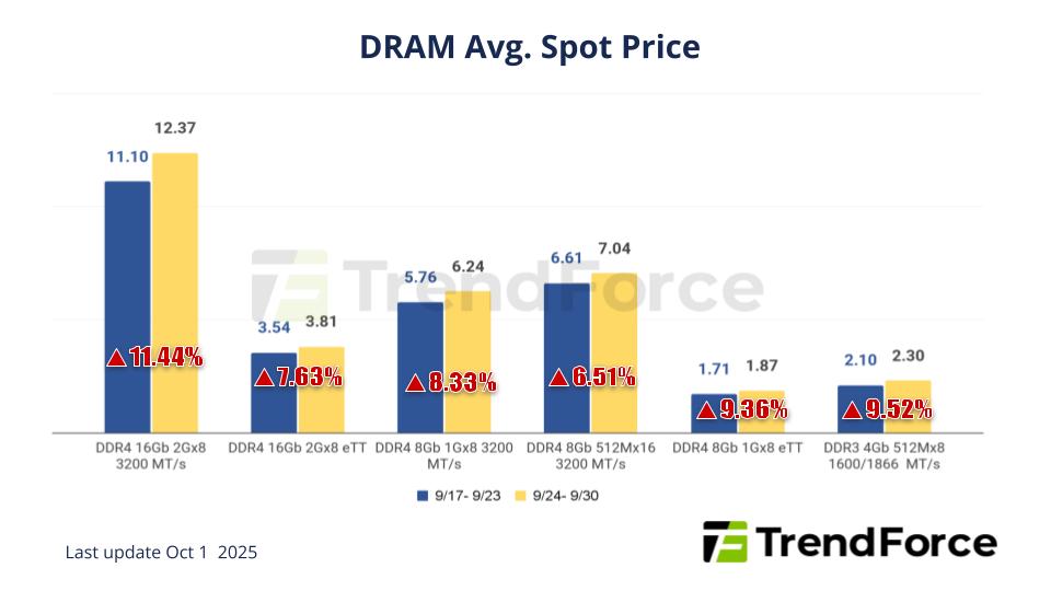 研究机构TrendForce的最新内存现货价格趋势报告显示,DRAM现货报价持续上涨,主流芯片如DDR5 16Gb、DDR4 8Gb、DDR3和eTT产品均呈现这一趋势,反映出市场对未来价格继续上涨的信心。本周,DRAM现货市场继续保持看涨氛围,卖家因预期价格进一步上涨而惜售,导致价格在高水平上显著巩固。买家积极囤货,但供应有限,使得价格上涨的同时交易量减少。主流芯片的平均现货价格(如DDR4 1Gx8 3200MT/s)从上周的6.033美元上涨至6.359美元,涨幅达5.40%。
