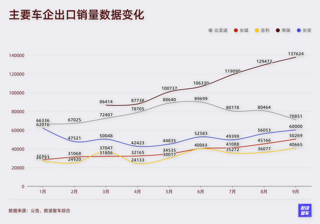 目前,海外市场,奇瑞仍然处于领先地位。9月奇瑞海外销量高达137624台,连续5个月销量破10万台。