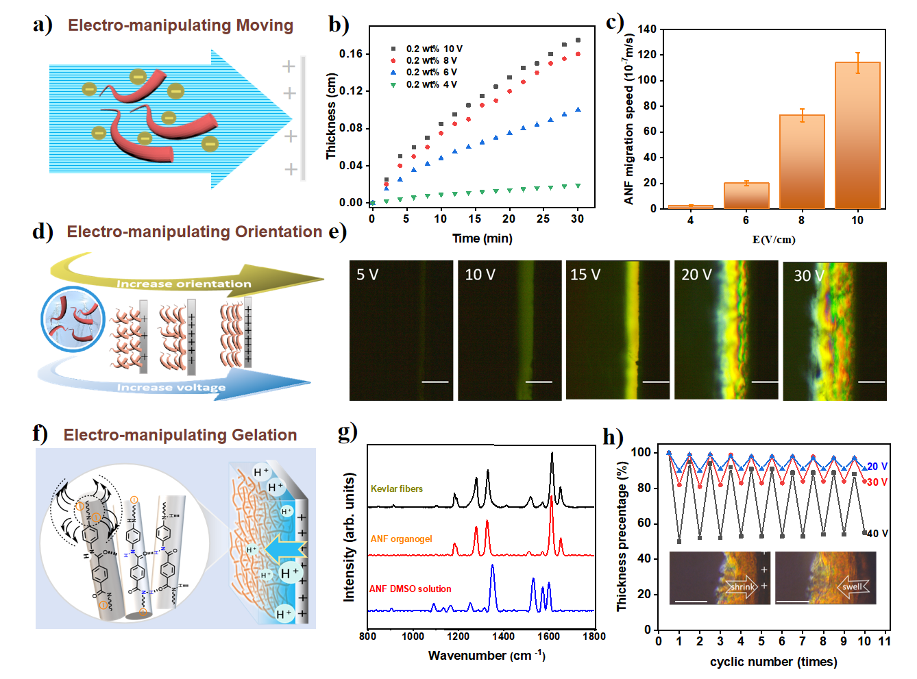 图2 电操控负电荷芳纶纳米纤维迁移、取向、凝胶化