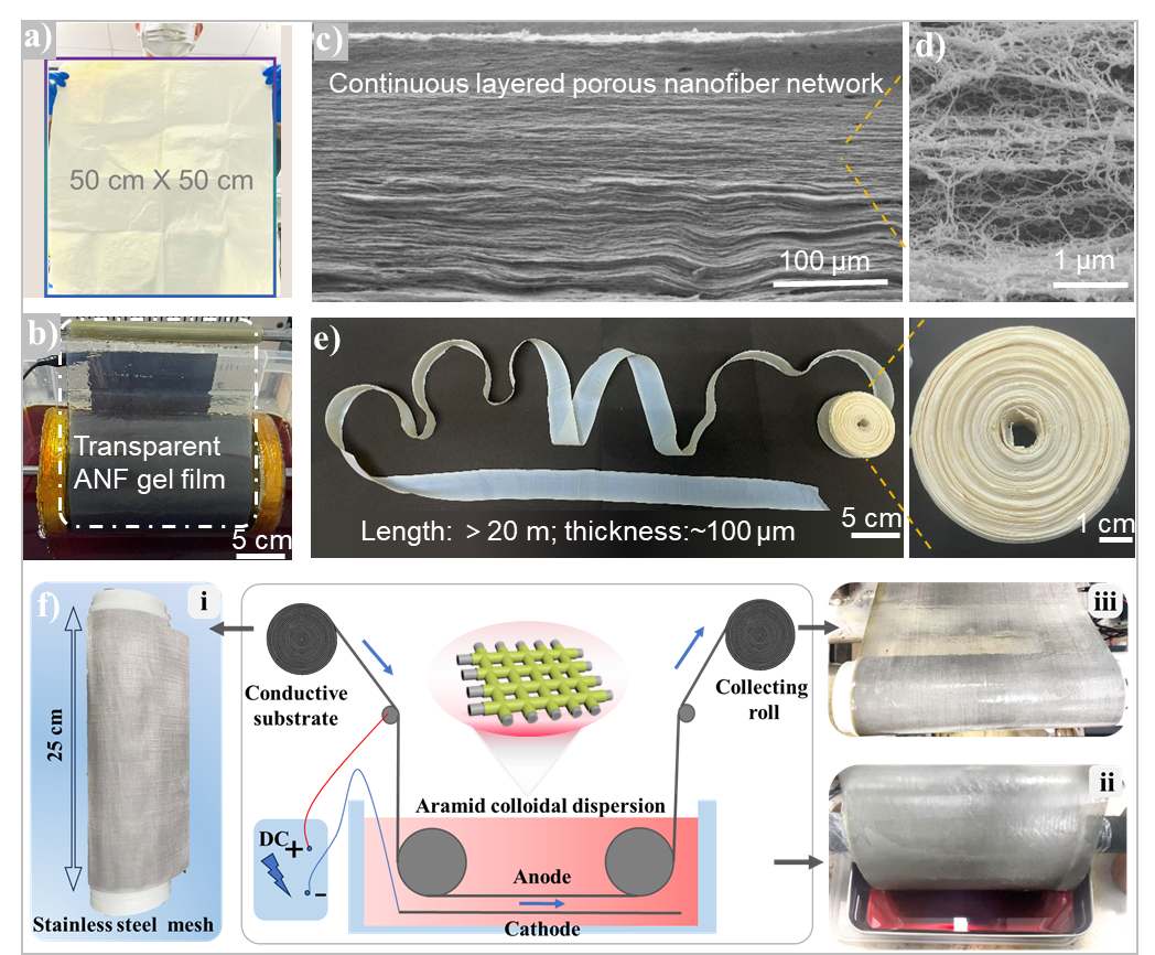 鉴于此,中国科学院苏州纳米技术与纳米仿生研究所张学同研究员团队提出了一种电场操控(Electro-manipulating,EM) 新策略,结合电泳组装与电化学凝胶化技术,实现对带负电芳纶纳米纤维运动、取向及凝胶化过程的精准控制,从而制造出结构明确的微/宏观芳纶胶体气凝胶薄膜(图1)。该工作以Electro-manipulating of negative-charged aramid nanofibers towards micro-to-macro scale colloidal aerogel films为题发表在Nature Communications上。