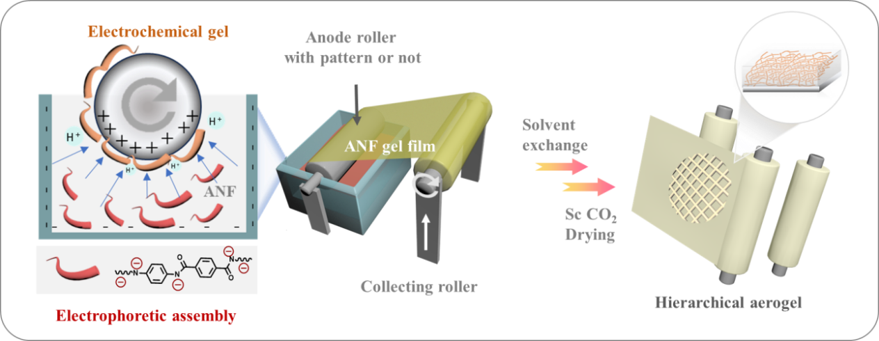 具体而言:首先,通过碱/DMSO溶液剥离Kevlar纤维制备带负电的芳纶纳米纤维分散液;随后,在直流电场作用下,利用电泳效应驱动纳米纤维向阳极定向迁移并有序排列;同时,借助阳极界面电化学反应(DMSO分解产生H⁺)诱导纳米纤维再质子化并发生物理交联,最终在阳极表面原位形成具有三维网络结构的凝胶膜。该过程无需添加任何化学交联剂,避免了杂质引入,保证了最终气凝胶的高纯度,且凝胶结构与电场参数(电压、时间)直接关联,为实现气凝胶从纳米到宏观尺度的精准结构调控提供基础(图2)。