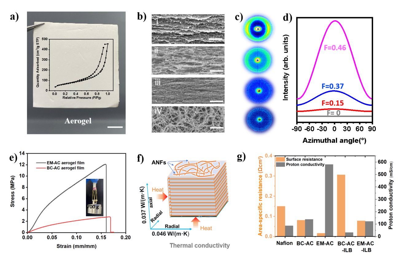 该工作中,所得EM-AC气凝胶膜呈现出独特的层状堆叠结构,纳米纤维在膜面内高度取向(图3)。通过调控电场强度,可精确控制气凝胶的密度(21.2 - 112.1 mg/cm³)、孔隙率及纳米纤维的取向度(0.15 - 0.46)。这种各向异性的精细微观结构显著提升了气凝胶的综合性能:远优于同密度传统气凝胶膜的力学性能;更低的面外方向热导率;远优于商用Nafion膜的质子电导率,在能源、电池等领域展现潜在的应用优势。