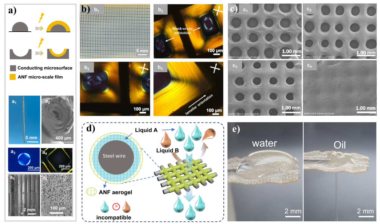 该EM策略具备卓越的微结构构造能力。研究团队通过在具有微结构的导电基底(如微针、微孔、图案化模板、不锈钢网)上进行原位溶胶-凝胶转变,成功制备了各种复杂形状的共形气凝胶壳层结构(图4)。例如,在不锈钢网上形成的共形气凝胶网络,兼具宏观孔道的高通量传输与气凝胶纳米网络的多功能特性,在油水分离实验中表现出有效的选择性分离能力,并可结合基底的电磁感应加热功能实现高粘度原油的分离回收。