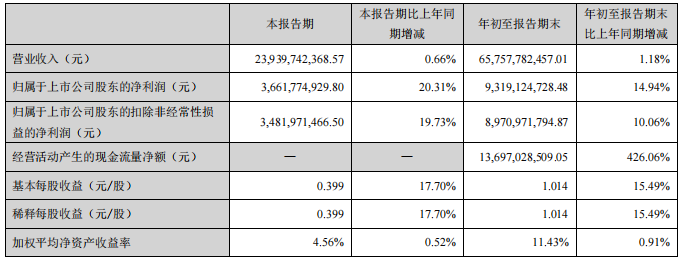 本报告期(第三季度),公司实现营业收入239.40亿元,较上年同期增长0.66%;归属于上市公司股东的净利润36.62亿元,同比增幅20.31%;归属于上市公司股东的扣除非经常性损益的净利润34.82亿元,同比增长19.73%。基本每股收益0.399元/股,同比增长17.70%,加权平均净资产收益率4.56%,较上年同期增加0.52个百分点。