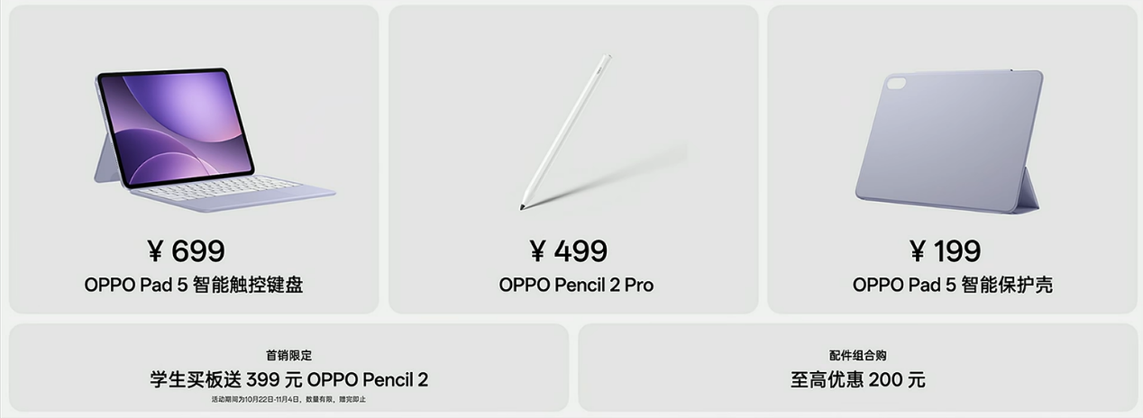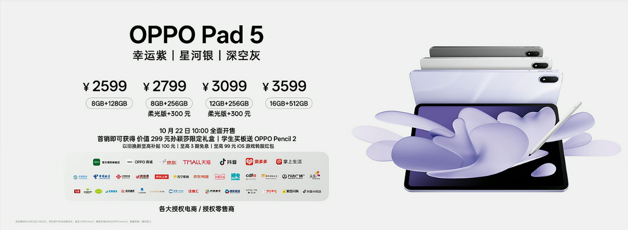 OPPO Pad 5将于10月22日10:00全面开售,8GB+128GB售价2599元;8GB+256GB售价2799元,12GB+256GB售价3099元,16GB+512GB售价3599元;8GB+256G柔光版售价3099元,12GB+256GB柔光版售价3399元;OPPO Pad 5智能触控键盘售价699元,OPPO Pencil 2 Pro售价499元,OPPO Pad 5智能保护壳售价199元。首销限量加赠价值 299元 孙颖莎限定礼盒,学生购机赠送价值 399元 OPPO Pencil 2,数量有限赠完为止,配件组合购至高优惠200元。