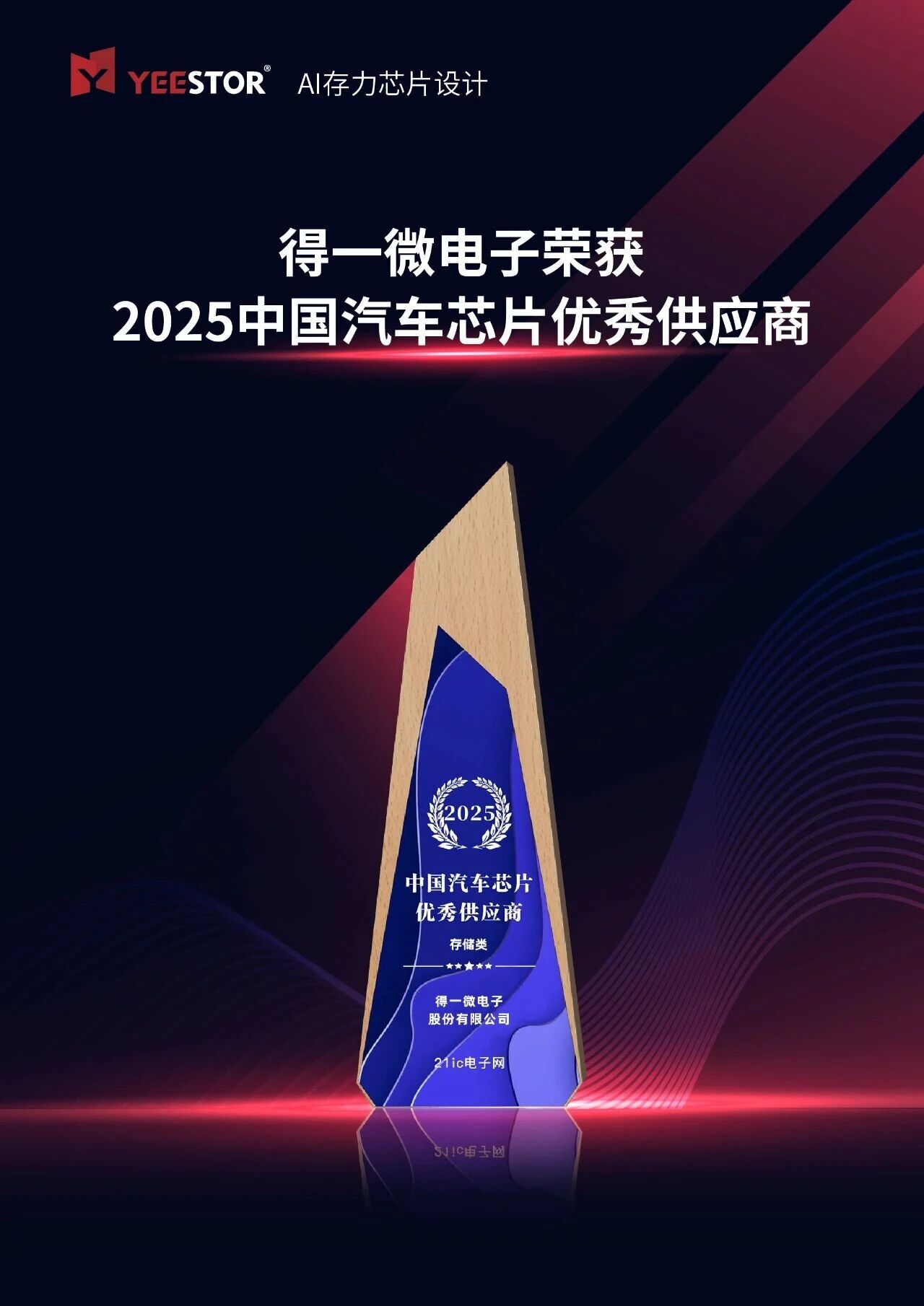 近日,2025世界智能网联汽车大会(WICV)在北京盛大举行,得一微电子(YEESTOR)凭借在汽车存力领域的自主技术实力和领先市场表现,于大会同期举办的“中国芯”汽车芯片供需对接会上,荣获“2025中国汽车芯片优秀供应商”奖。