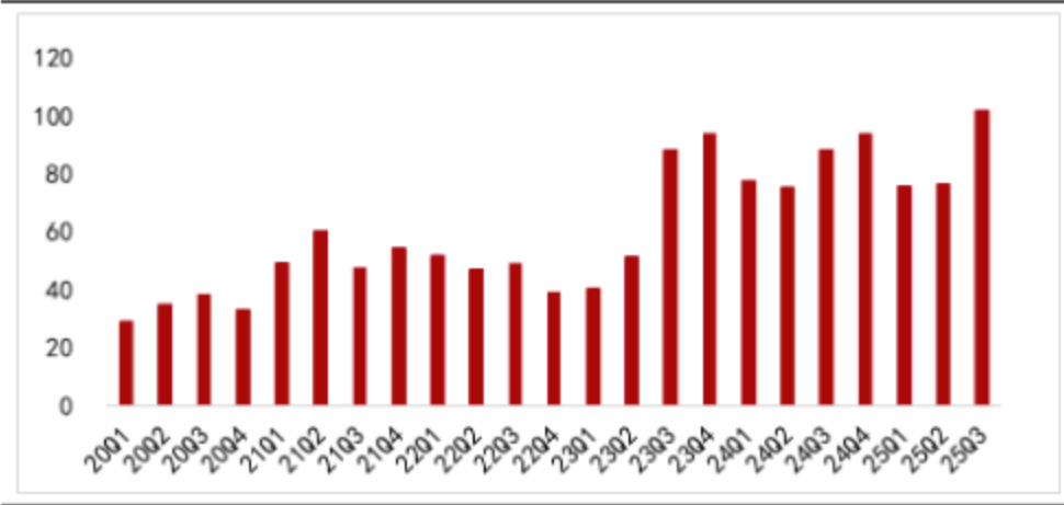 近日,海关总署公布的数据显示,2025年第三季度前道制造设备进口总额达到101.87亿美元,同比增长15.28%,环比增长33.15%,创下历史最高纪录。