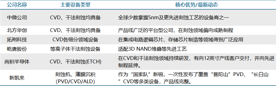 CVD与干法刻蚀设备是构建芯片微观结构(如介质层和导线沟槽)的核心工艺装备。其需求持续旺盛,直接反映出国内晶圆厂正在大规模扩产先进逻辑芯片(如28nm及以下节点)和高端存储芯片。这类工艺对薄膜沉积的复杂程度、层数以及刻蚀精度提出了更高要求,因而带动了相关设备的需求增长。