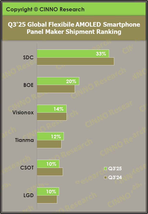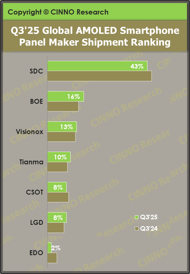 随着第三季度传统销售旺季的到来,苹果及国内主流品牌密集发布旗舰新品,显著拉动OLED面板的市场需求。根据CINNO Research统计数据显示,2025年第三季度全球AMOLED智能手机面板出货量约2.5亿片,同比增长11.7%,环比增长20.3%,实现同比与环比双增长,市场景气度持续回升。