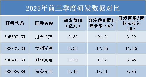 清溢光电以4.85%的研发强度位居第二,路维光电和冠石科技分别为3.45%和3.22%,相对较为接近。