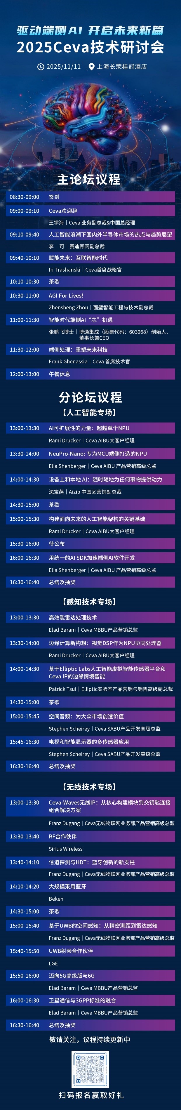 全球领先的智能边缘领域半导体产品和软件IP授权许可厂商Ceva公司将于2025年11月11日在上海长荣桂冠酒店举办2025 Ceva技术研讨会。