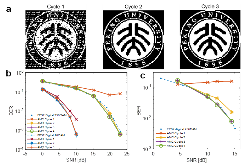 在应用验证层面,该方法被成功应用于大规模多输入多输出(MIMO)系统的信号检测任务。研究团队展示了基于迫零检测的图像恢复效果,在第二个迭代周期内,接收图像即与原始图像达到高度一致。进一步的误码率-信噪比分析显示,仅需三次迭代,该系统在无线通信场景下的检测性能即可媲美32位浮点精度数字处理器(图4),凸显出其在实时信号处理中的潜力。