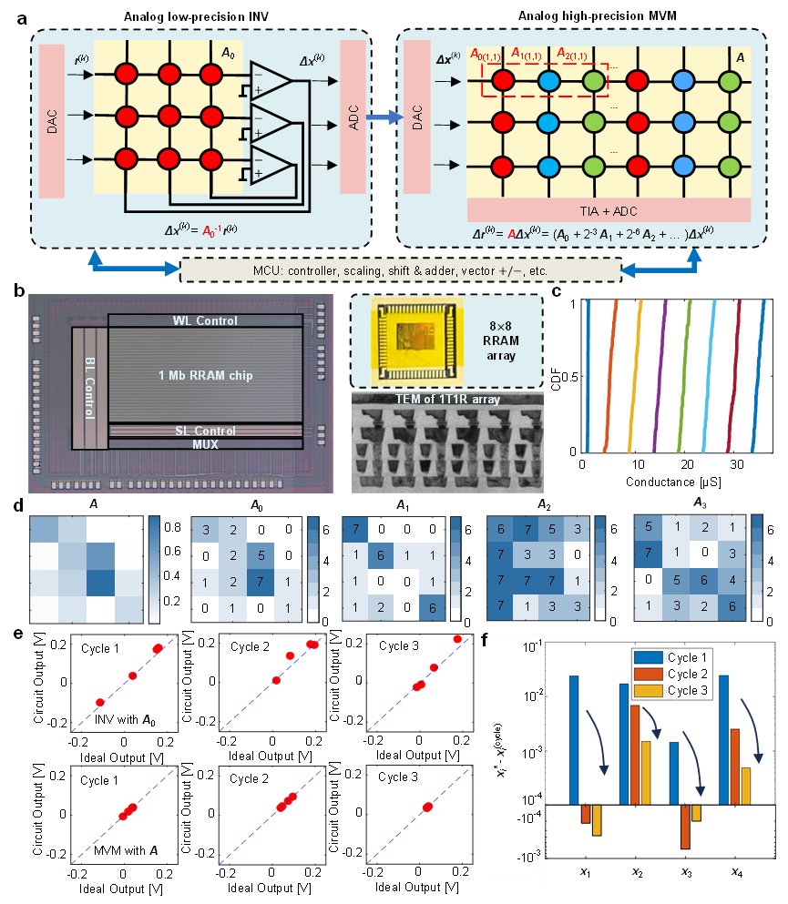 在这项工作中,研究团队选择了一条融合创新的道路,构建了一个基于阻变存储器阵列的高精度、可拓展的全模拟矩阵方程求解器。通过新型信息器件、原创电路和经典算法的协同设计,首次将模拟计算的精度提升至24位定点精度。